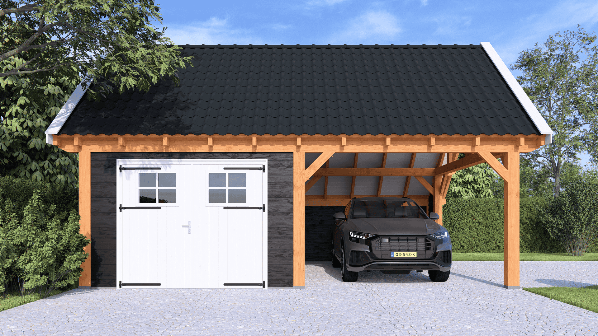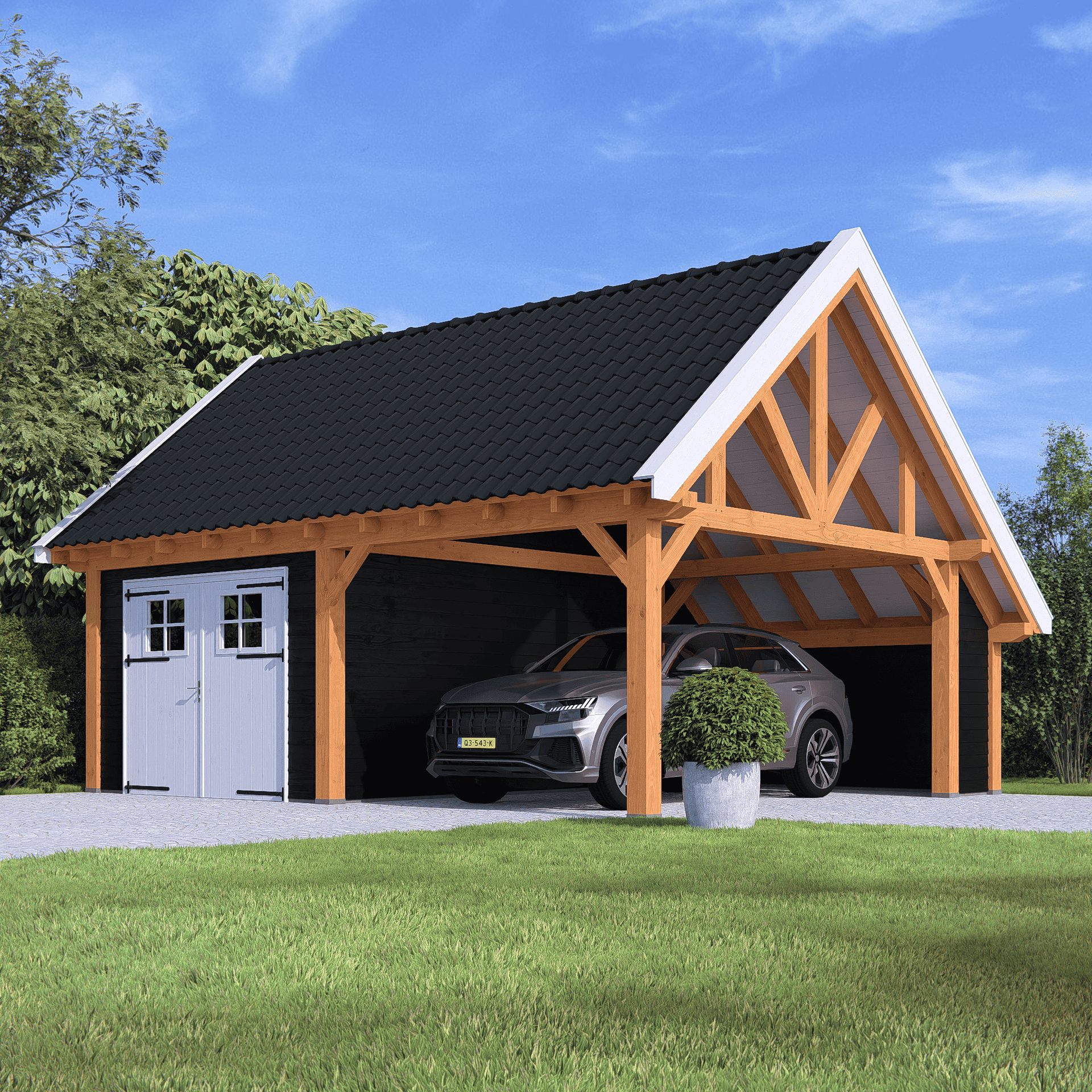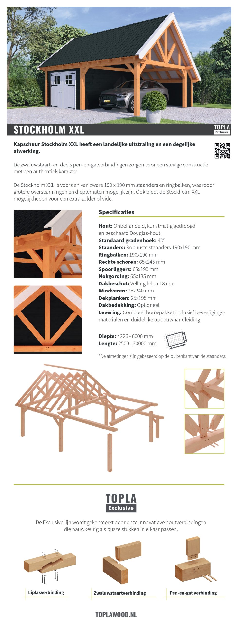 Buitenverblijf Stockholm XXL is het grootste type kapschuur in ons assortiment. Deze kapschuur beschikt over robuuste 190x190mm staanders en ringbalken, die meer diepte creëren in vergelijking met de reguliere Stockholm. De tulpschoren met pen-en-gat-verbindingen dragen bij aan de landelijke en rustieke uitstraling. Met aandacht voor authentieke details wordt de kapschuur vakkundig afgewerkt.