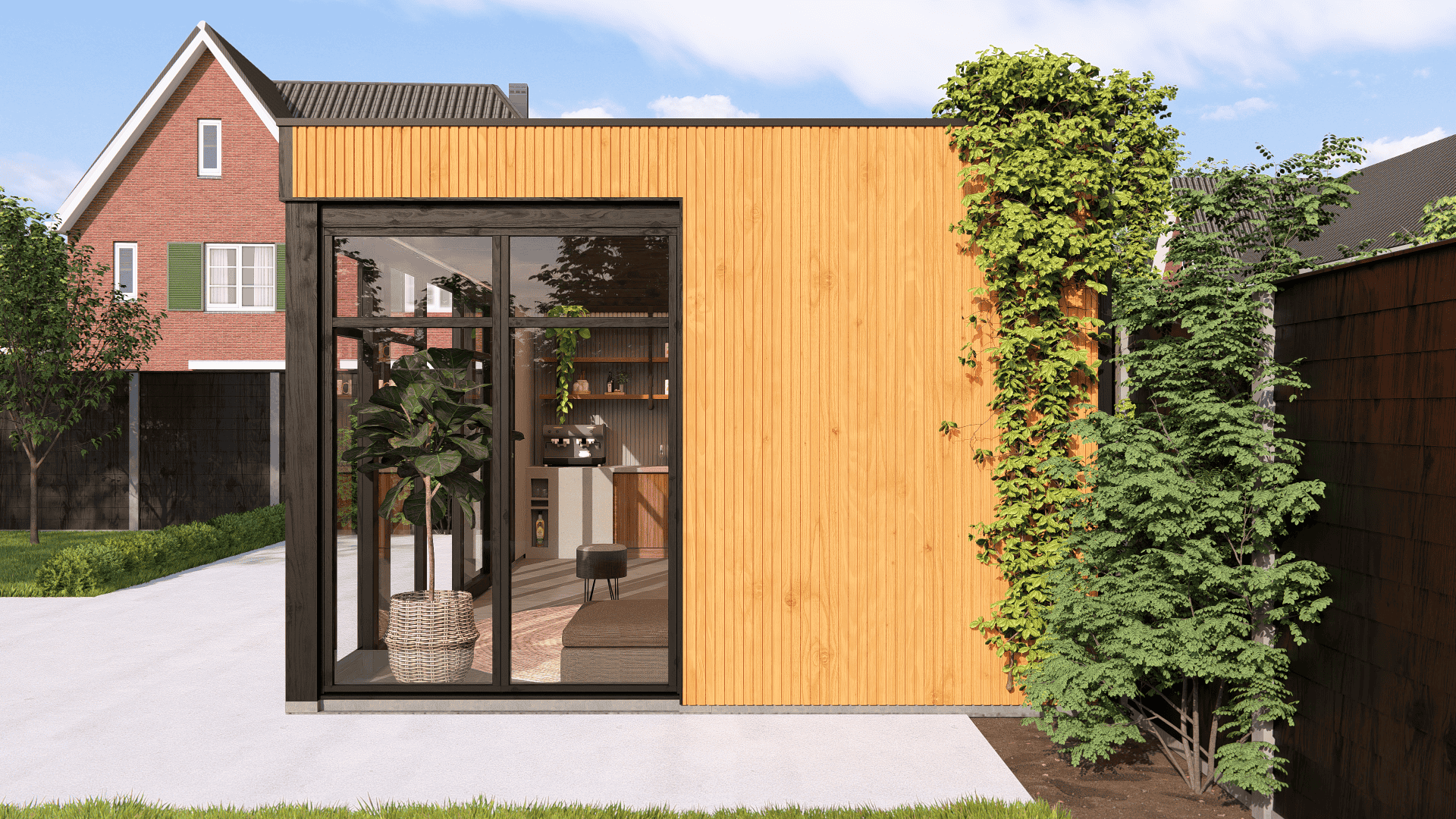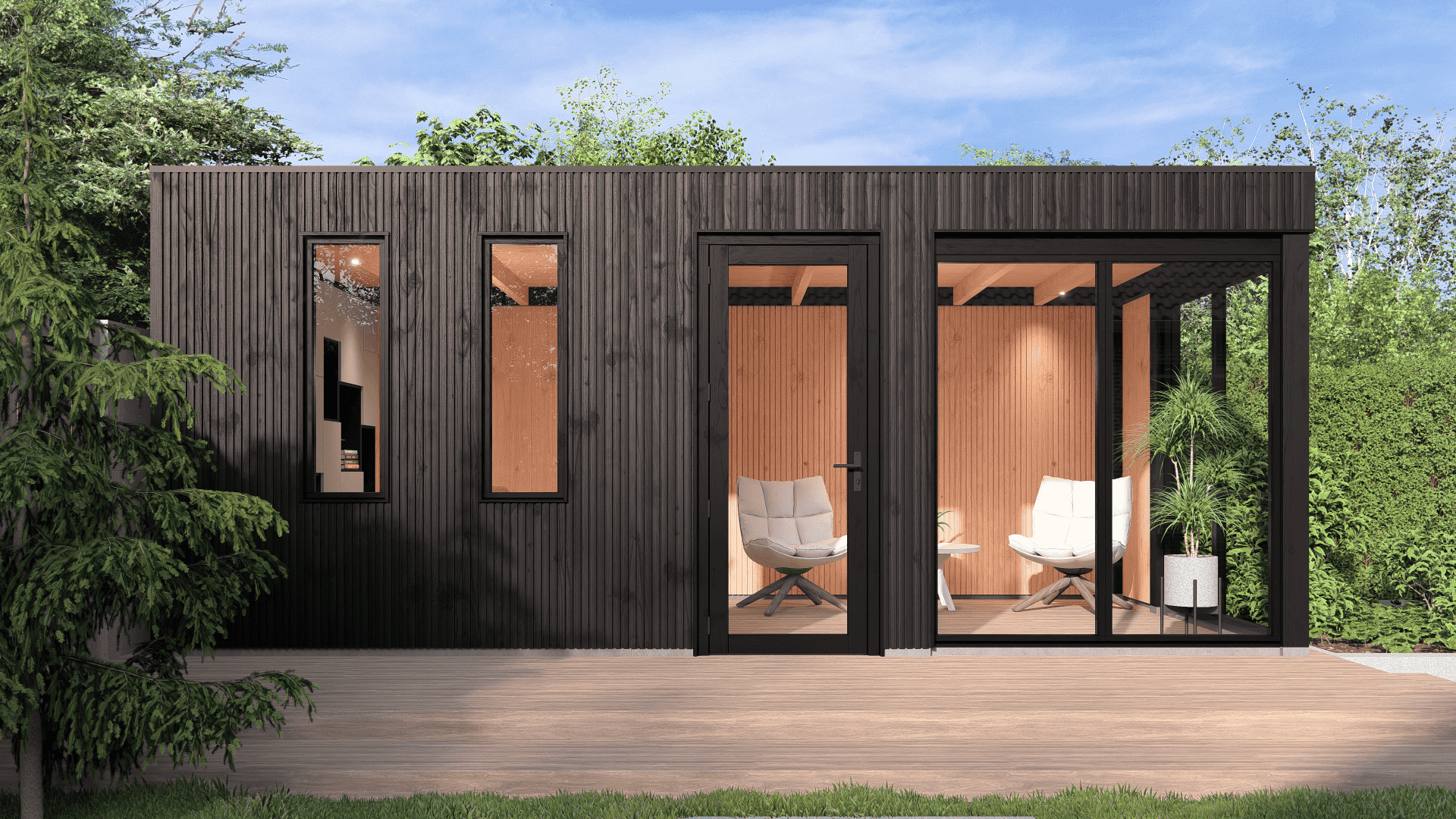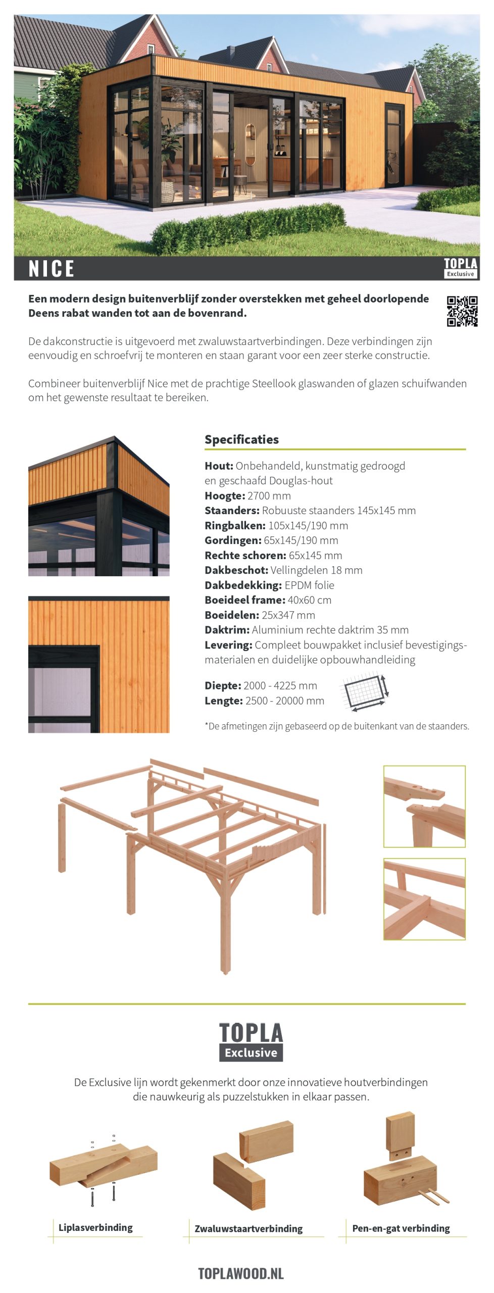 Buitenverblijf Nice, een toonbeeld van modern design dat direct de aandacht trekt met zijn strakke lijnen en hedendaagse uitstraling. Dit platdak onderscheidt zich door de geheel doorlopende Deens rabat wanden, die zorgen voor een naadloze en elegante afwerking van de grond tot de bovenrand. De dakconstructie, uitgevoerd met zwaluwstaartverbindingen, biedt zowel een robuuste structuur als verfijnde details. Het Buitenverblijf Nice voegt een moderne en luxe uitstraling toe aan elke tuin. Door het te combineren met steellook glaswanden of glazen schuifwanden creëer je een open en elegante sfeer. Ideaal voor wie op zoek is naar een moderne en veelzijdige buitenruimte die perfect aansluit bij elke esthetische voorkeur.