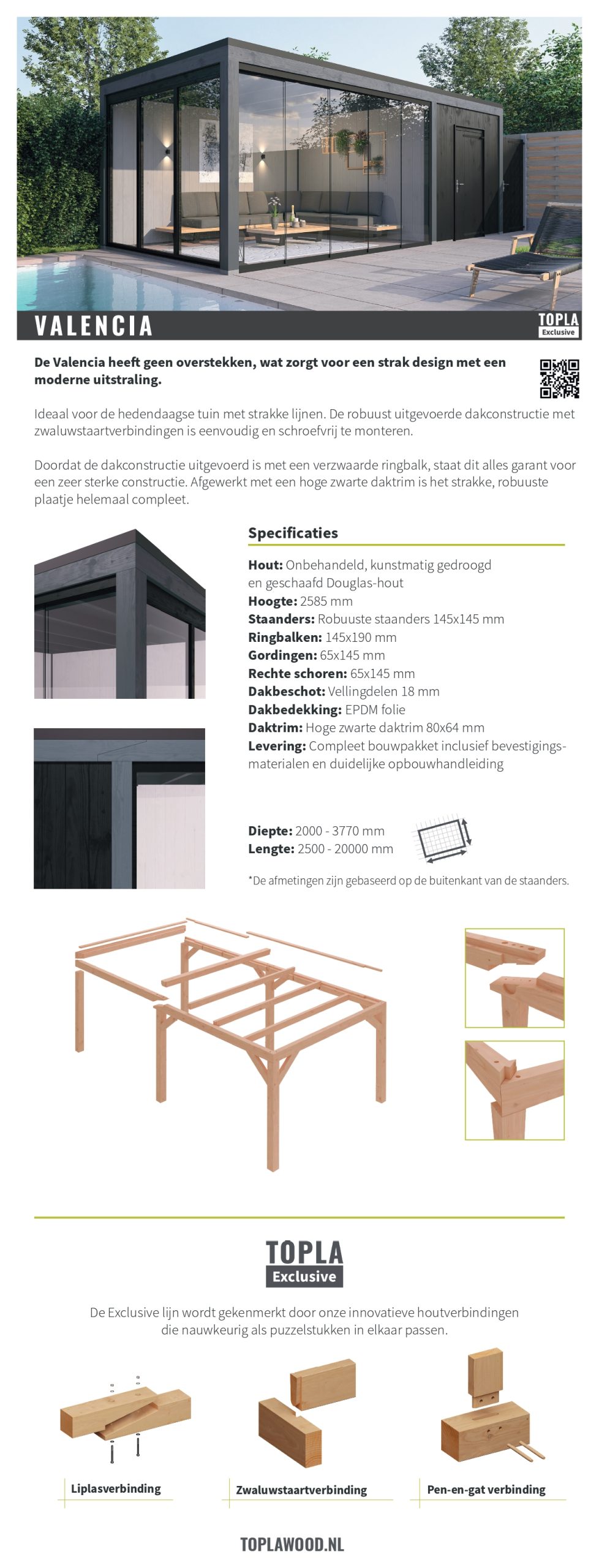Buitenverblijf Valencia is ontworpen zonder overstek, wat zorgt voor een strakke en moderne look. Het minimalistische design, gecombineerd met een luxe afwerking, maakt dat het buitenverblijf Valencia in elke omgeving tot zijn recht komt. De model-eigen zwaluwstaartverbinding zorgt voor een naadloze aansluiting van de ringbalken. Ook kunt u ervoor kiezen om de schoren weg te laten voor een extra verfijnd design.