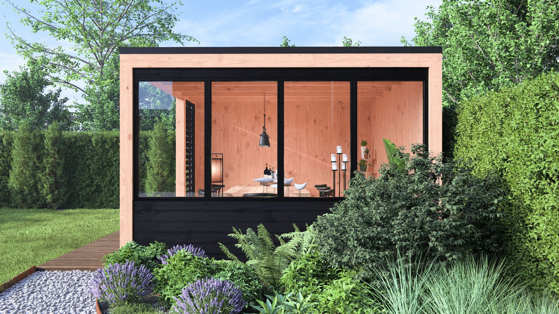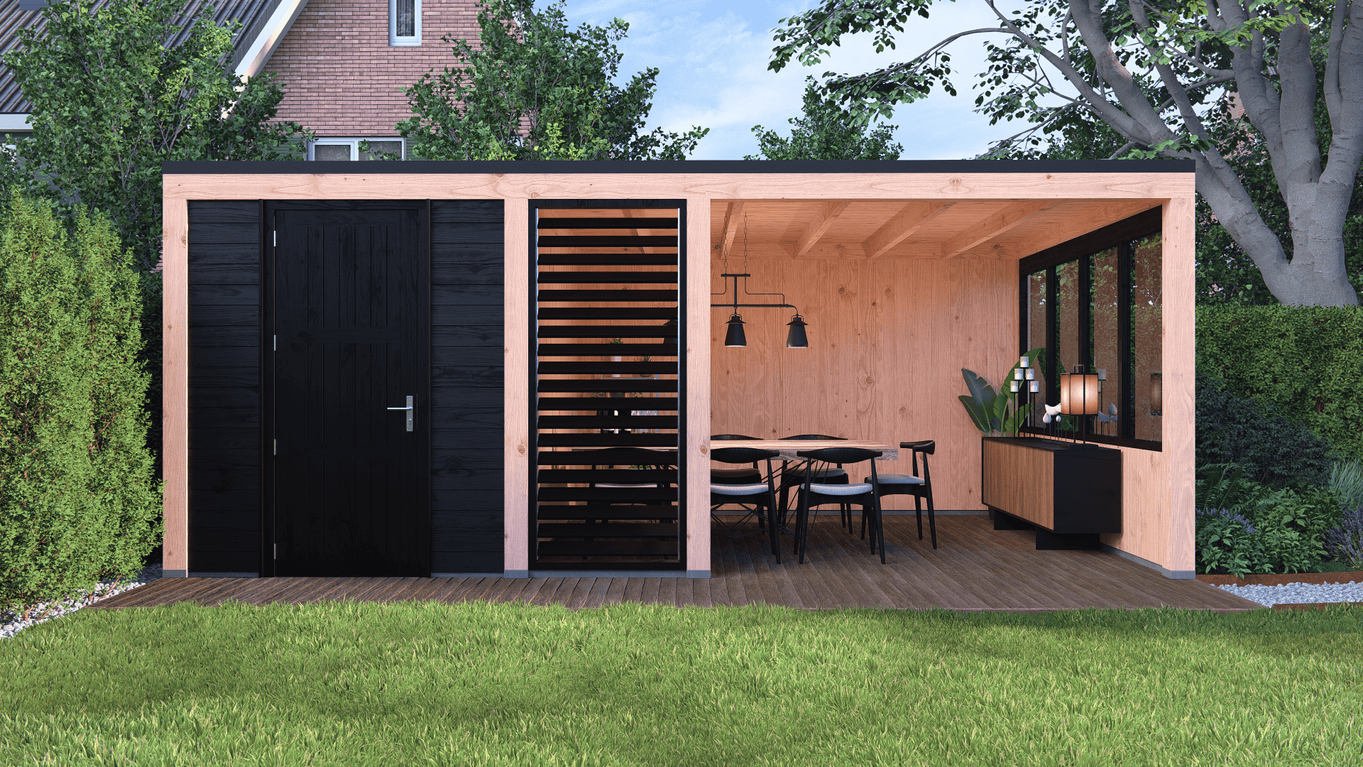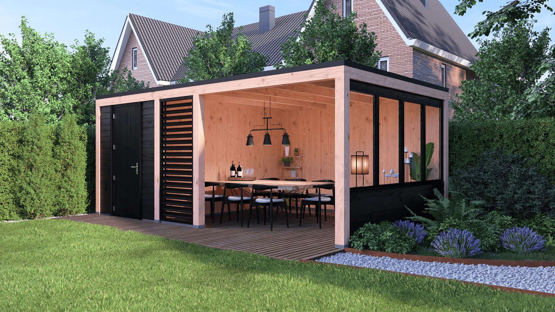 Door verschillende soorten wanden, ramen en deuren toe te voegen, kunt u het ontwerp verder personaliseren en optimaliseren naar uw wensen. Afgewerkt met een hoge zwarte daktrim is het strakke robuuste plaatje helemaal compleet.