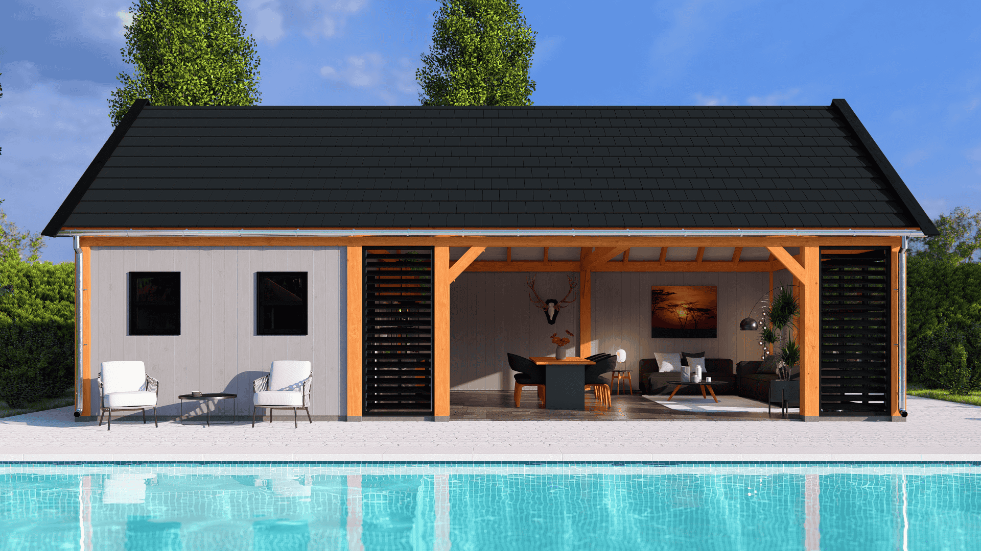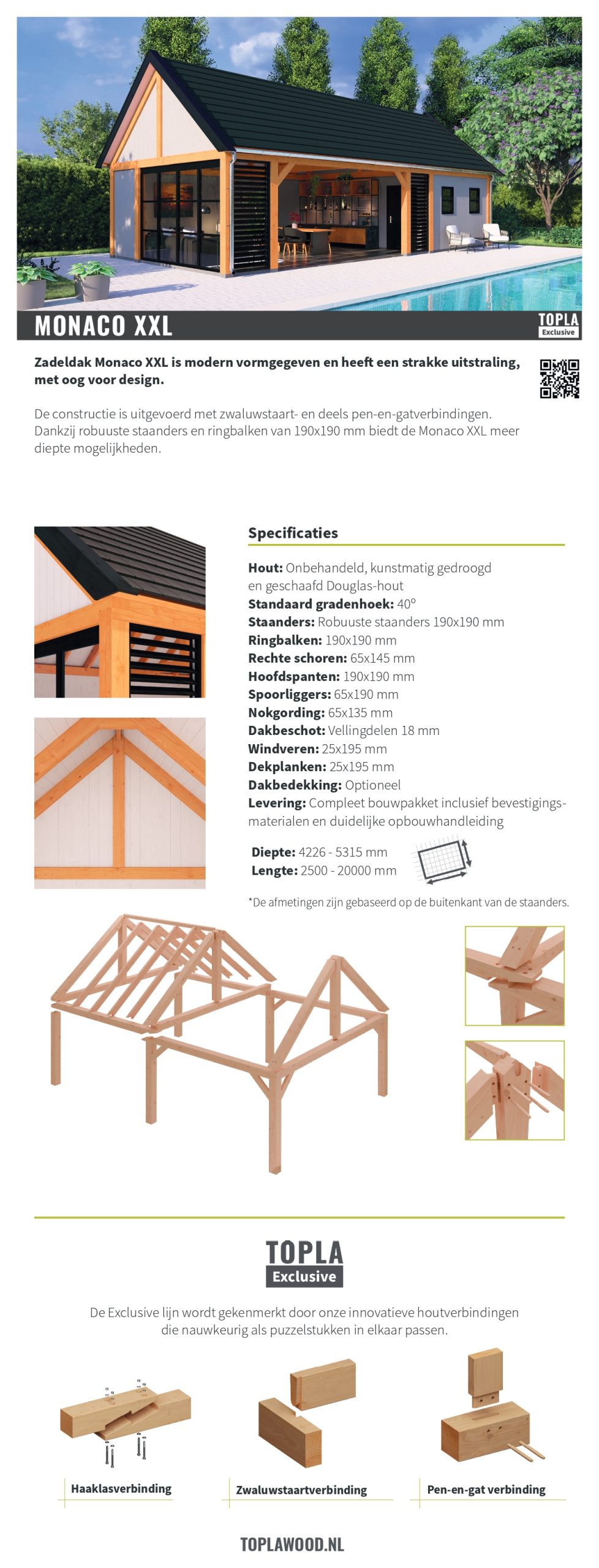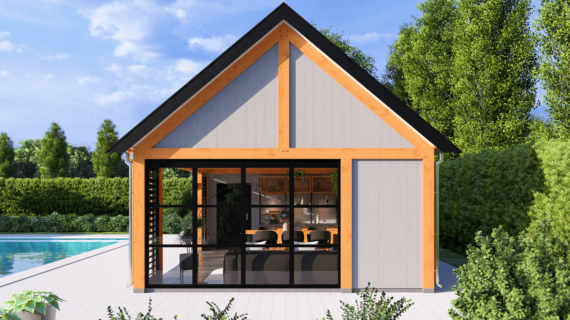 Buitenverblijf Monaco XXL creëert met zijn grote dakhelling een heldere en luchtige leefruimte op de bovenverdieping, perfect voor een vide of extra verdieping. Dit model is voorzien van staanders en ringbalken van 190×190 mm, wat zorgt voor extra diepte ten opzichte van de reguliere Monaco. Het strakke en onderscheidende ontwerp sluit naadloos aan bij een landelijke of bosrijke omgeving, waardoor het bijzonder geschikt is voor een poolhouse. Buitenverblijf Monaco XXL biedt niet alleen functionele voordelen, maar is ook een elegante en stijlvolle aanvulling op uw tuin.