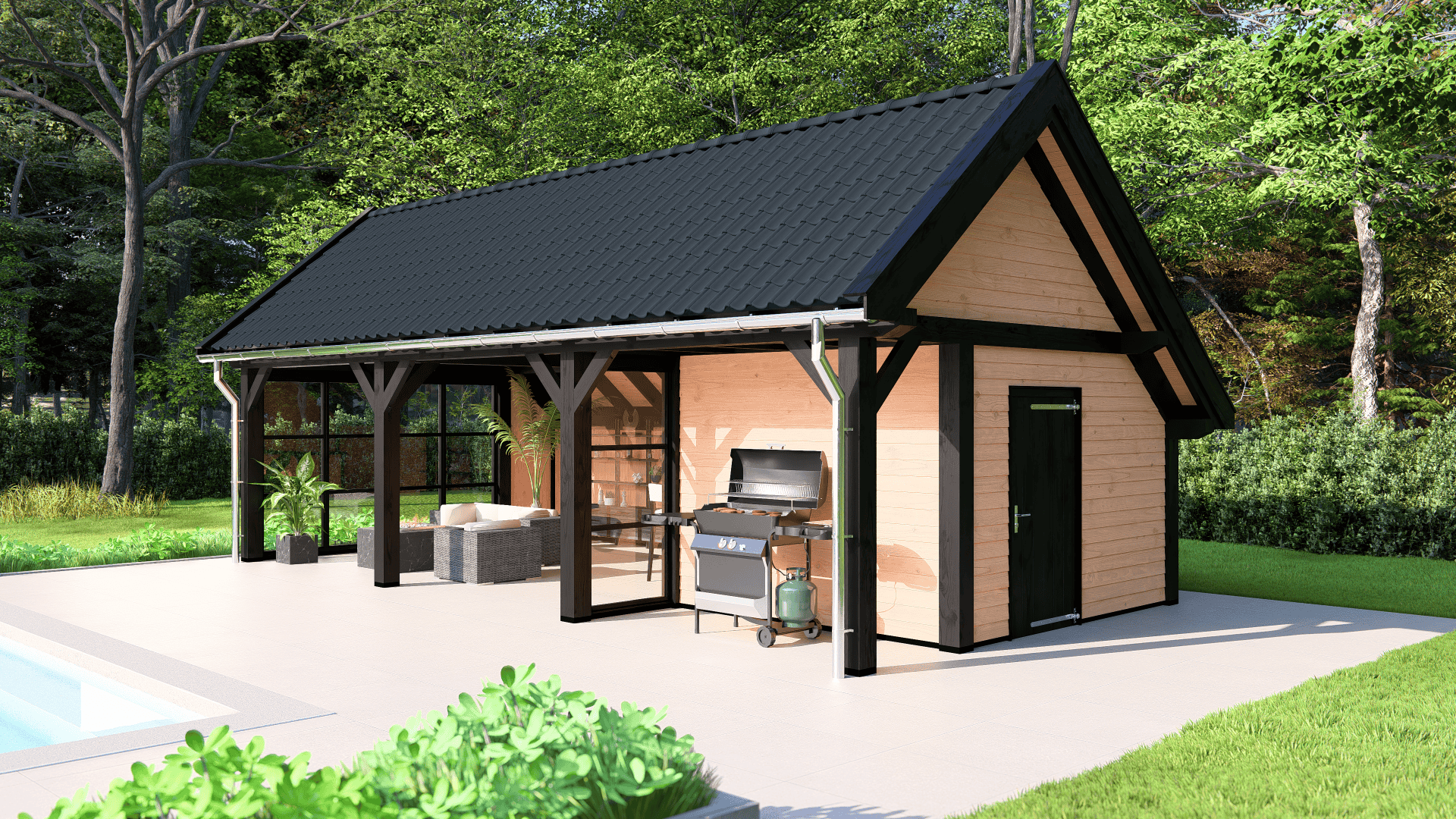 Buitenverblijf Stockholm XXL is het grootste type kapschuur in ons assortiment. Deze kapschuur beschikt over robuuste 190x190mm staanders en ringbalken, die meer diepte creëren in vergelijking met de reguliere Stockholm. De tulpschoren met pen-en-gat-verbindingen dragen bij aan de landelijke en rustieke uitstraling. Met aandacht voor authentieke details wordt de kapschuur vakkundig afgewerkt.