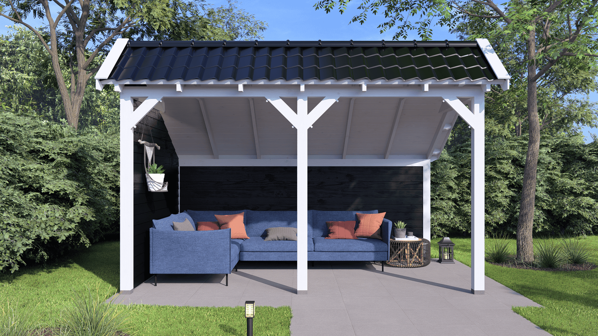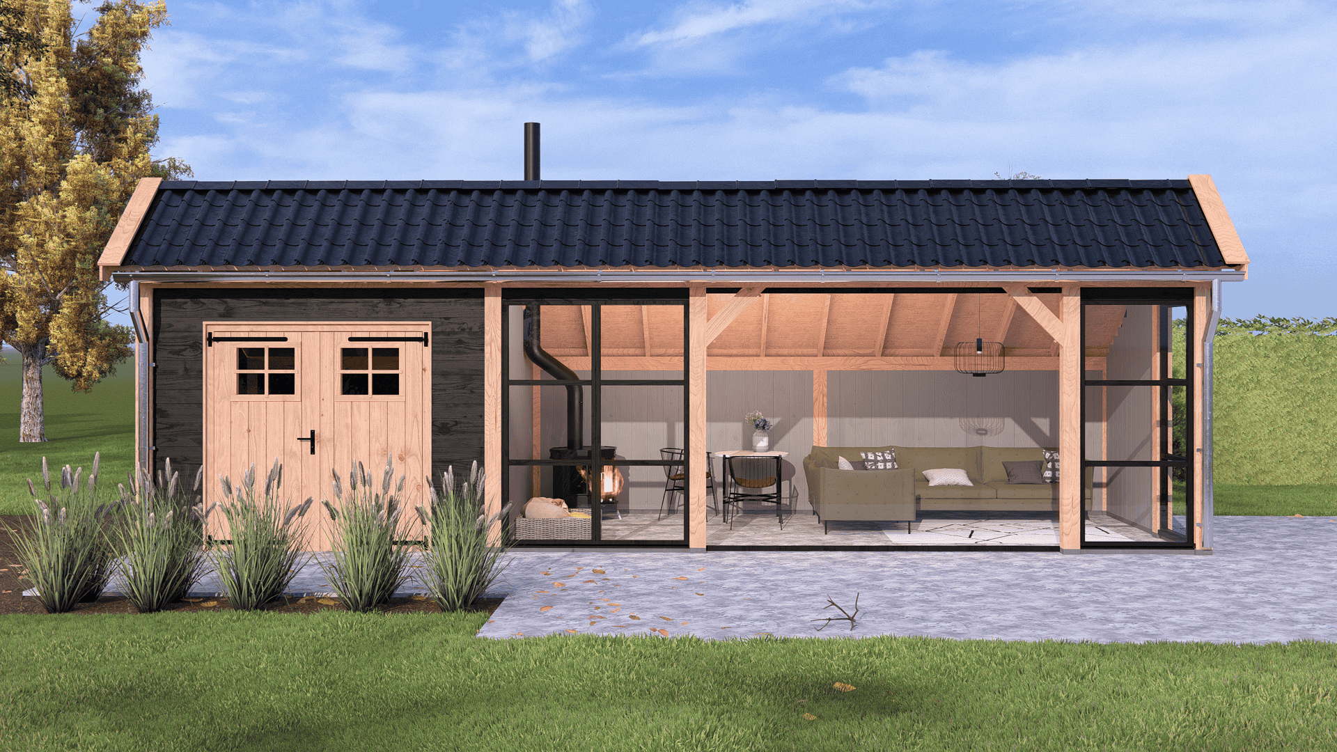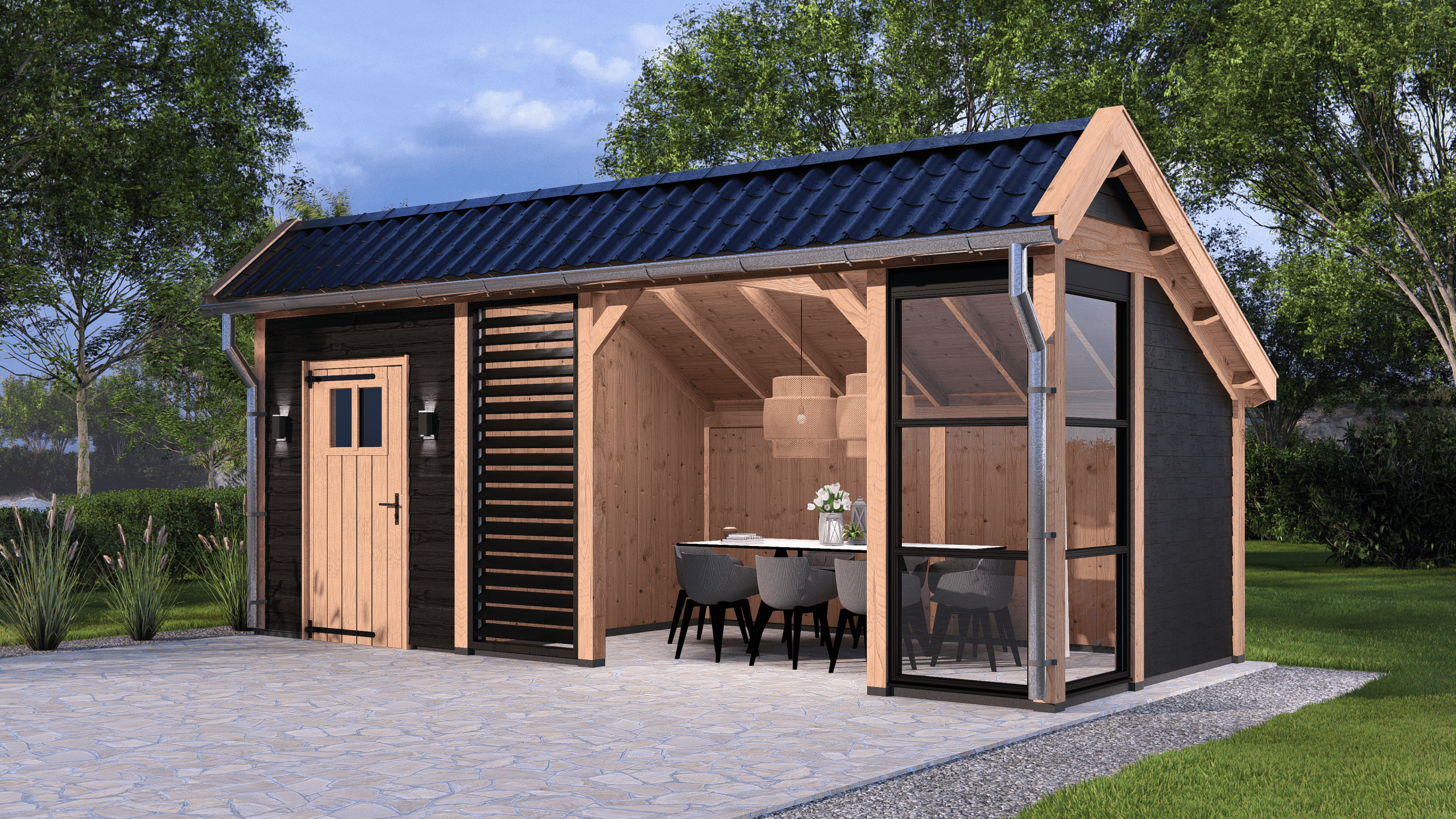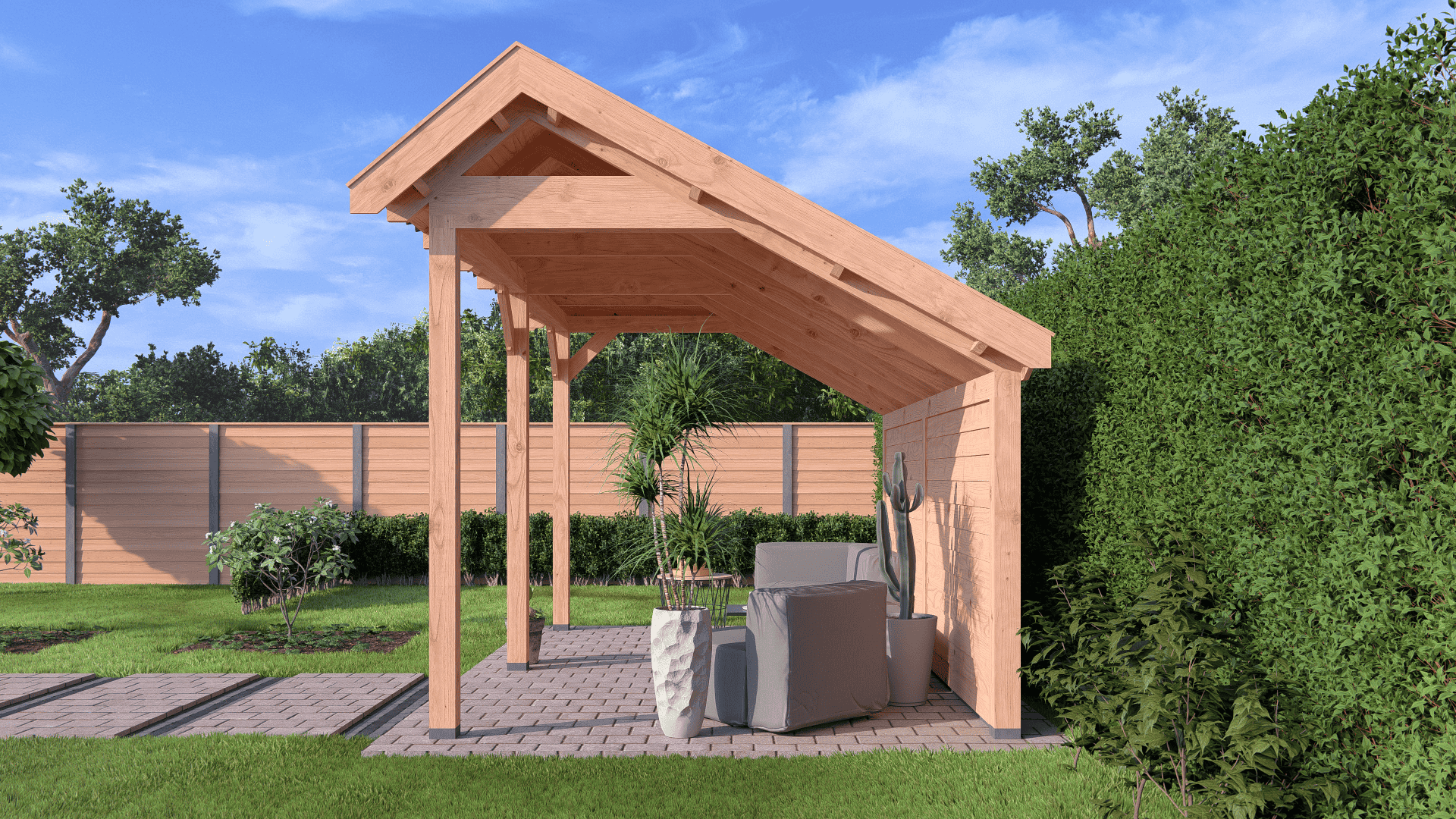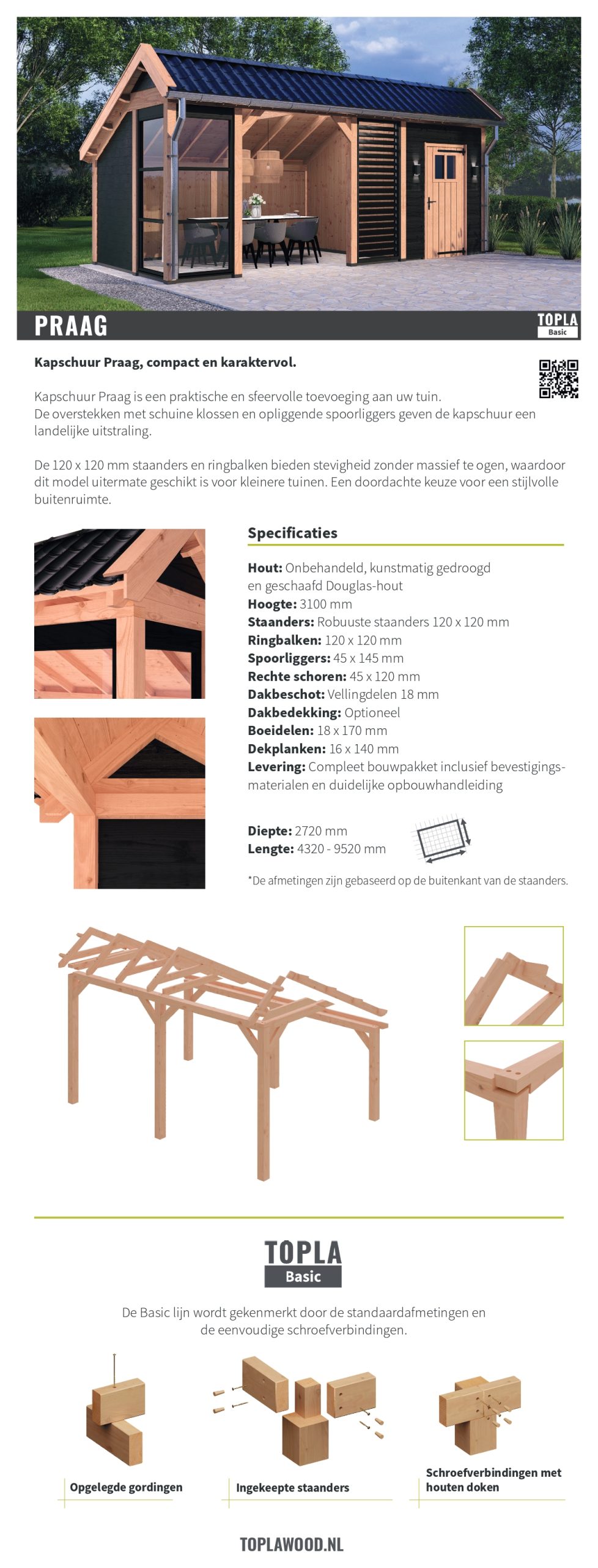 Buitenverblijf Praag is de enige kapschuur uit onze basic collectie. Het buitenverblijf combineert stijl en functionaliteit. Met zijn ongelijke dakvlakken en ruime overstekken biedt deze kapschuur praktische voordelen en een aantrekkelijke uitstraling. Kapschuur Praag heeft een ringbalk met een halfhoutverbinding en opliggende spoorliggers. Ook is het mogelijk om de voorgevelstaanders te verschuiven, zodat er eenvoudig een berging toegevoegd kan worden.